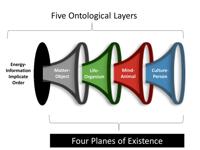 مدل بالا چهار لایهٔ مختلف هستی را نشان میدهد. ماده از دل انرژی روییده است. حیات و زندگی -که یکی دیگر از مفاهیم غیرقابل توضیح است- از دل ماده میآید و ذهن هم از المانهای زنده ساخته میشود. در لایه آخر نیز اذهان در کنار هم کار میکنند و موجودیتهایی از جنس فرهنگ میسازند.